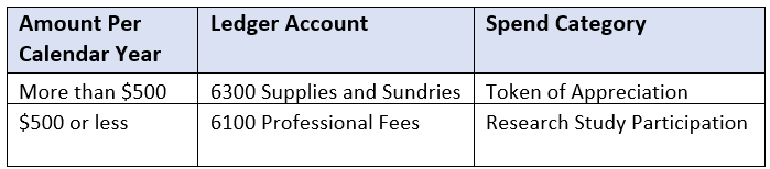 The amount paid to research participants per calendar year determines the ledger account and spend category in recording the payment: